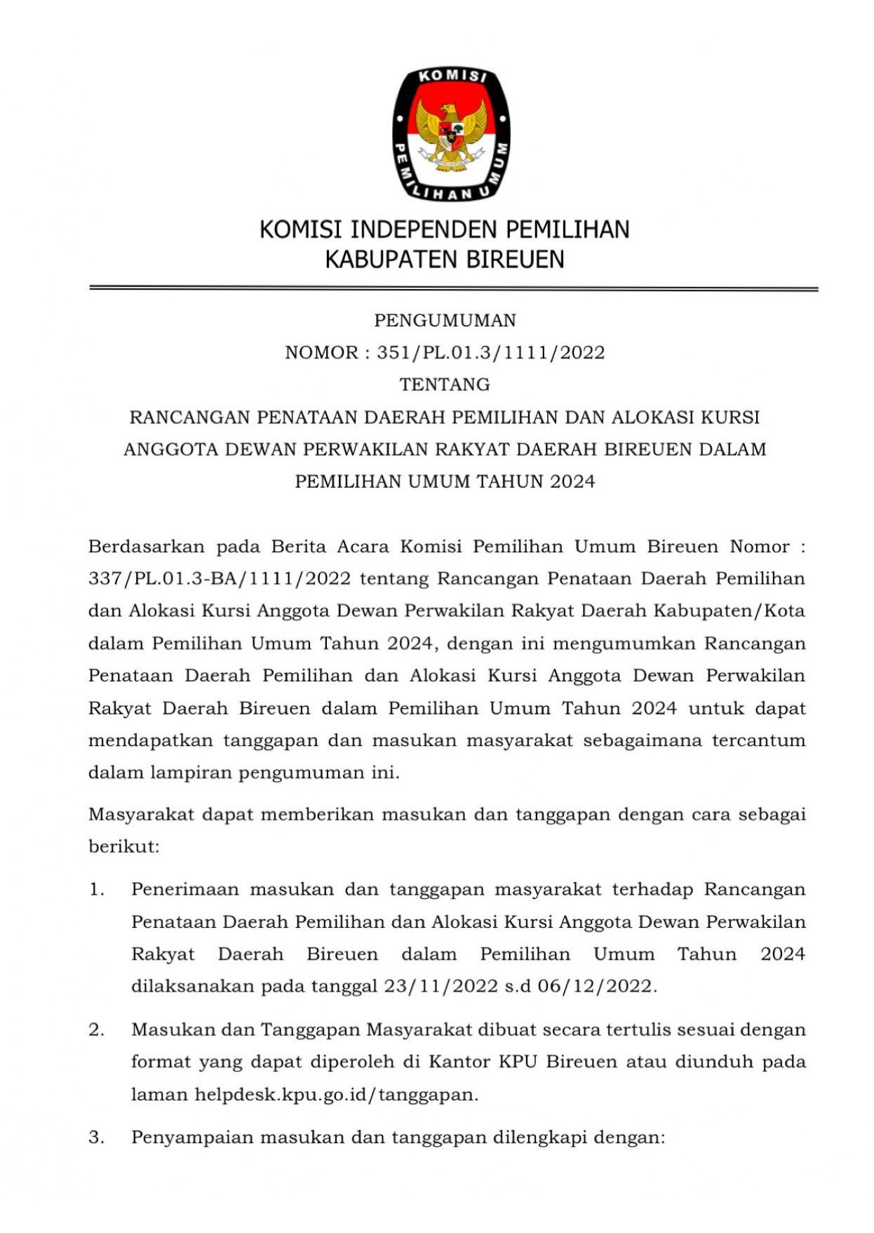 Pengumuman Penataan Daerah Pemilihan Anggota DPRK Bireuen Untuk Pemilu Tahun 2024.PDF