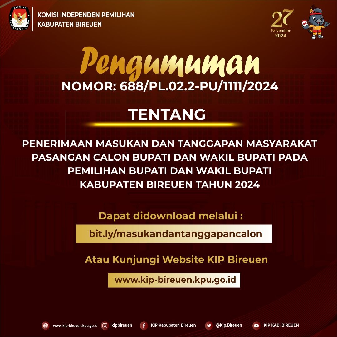 Berikut kami bagikan Pengumuman Pengumuman Penerimaan Masukan dan Tanggapan Masyarakat Pasangan Calon Bupati dan Wakil Bupati pada Pemilihan Calon Bupati dan Wakil Bupati Kabupaten Bireuen Tahun 2024 dapat diunduh DISINI