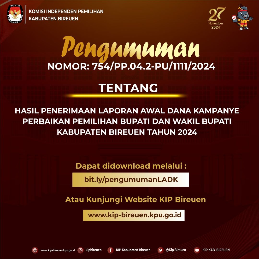 berikut kami bagikan pengumuman hasil penerimaan laporan penerimaan sumbangan dana kampanye Pemilihan Bupati dan Wakil Bupati Bireuen Tahun 2024.